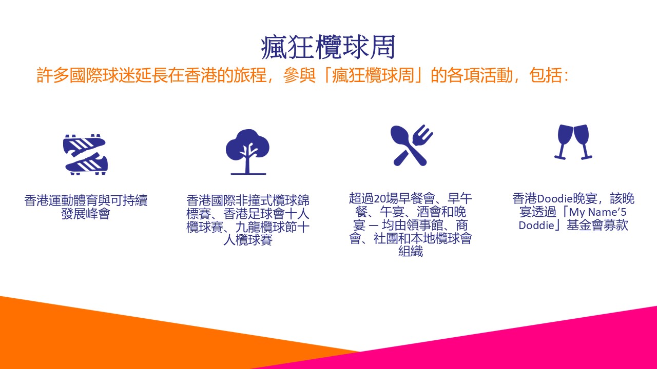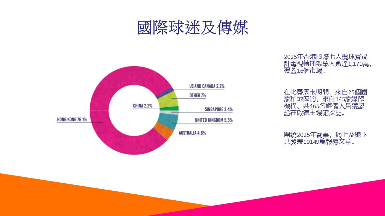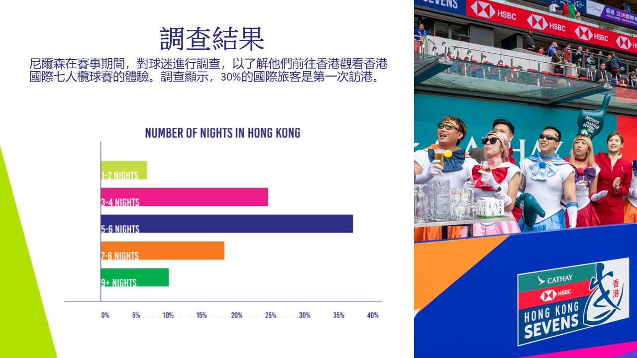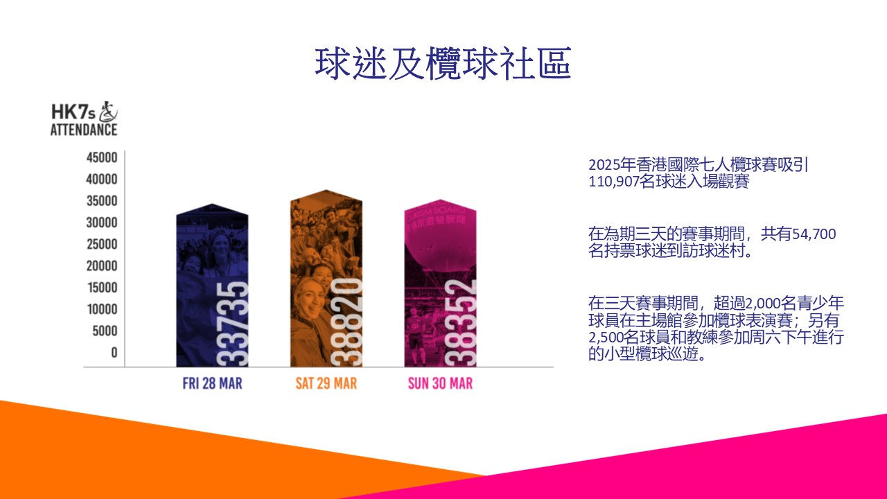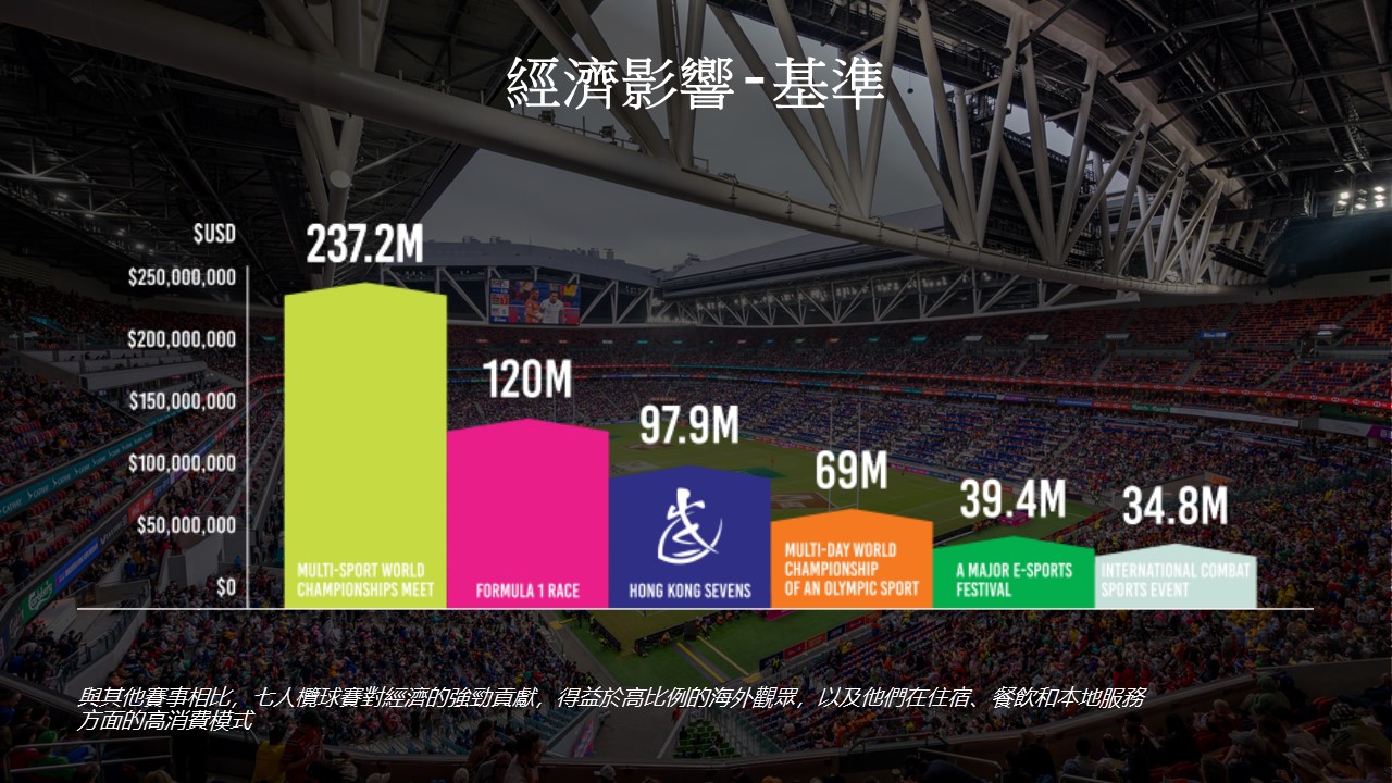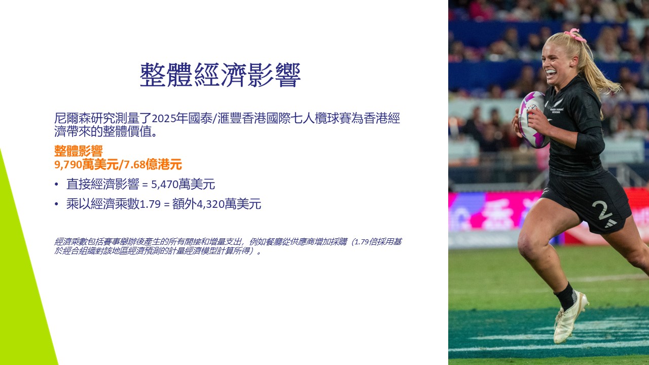以下是一些關鍵數據,包括國際市調公司尼爾森(Nielsen)的報告,揭示香港國際七人欖球賽為香港經濟帶來的整體價值。根據全球領先的經濟影響報告公司尼爾森(Nielsen)的數據,2025年香港國際七人欖球賽為香港帶來港幣7.68億的經濟效益。